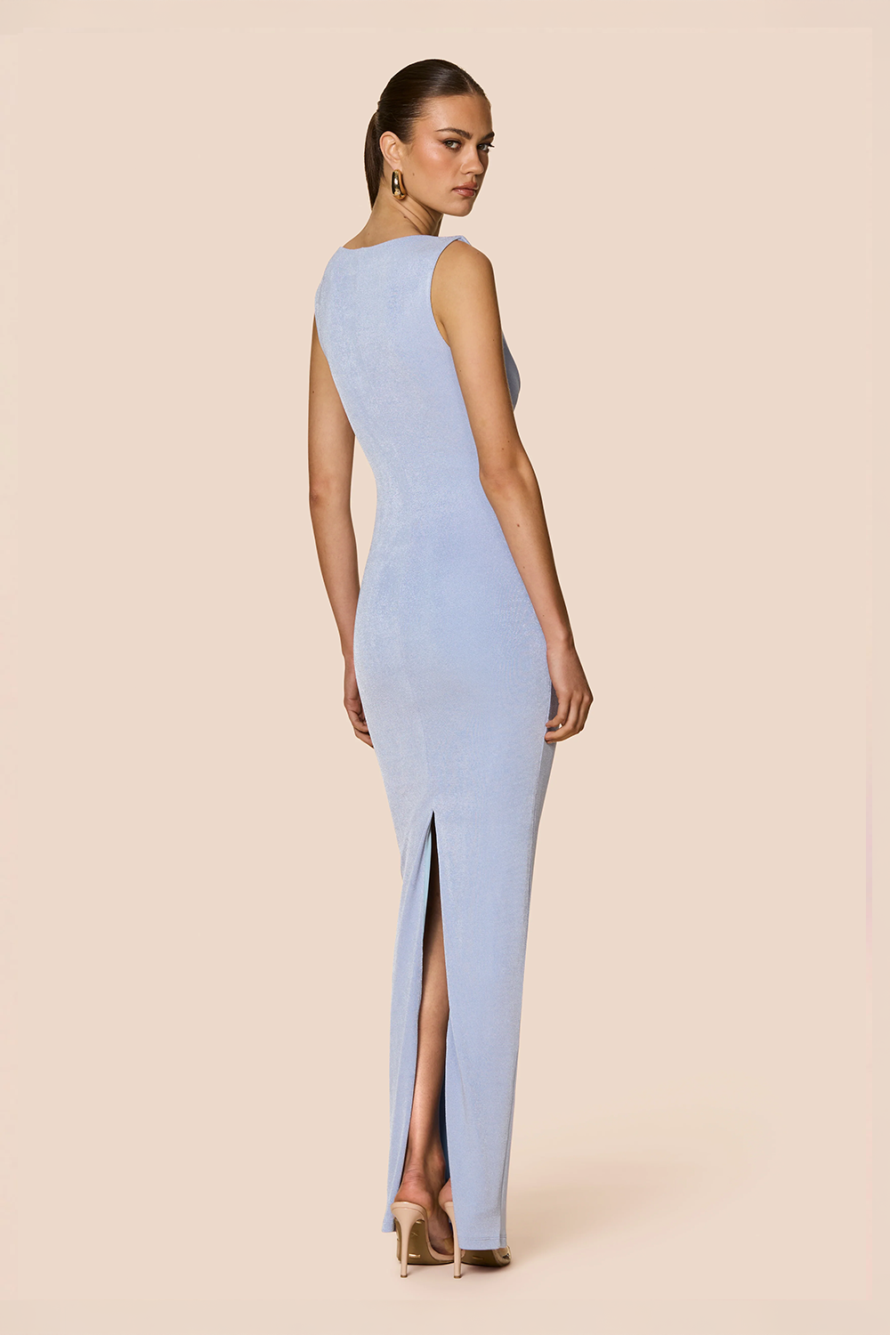 Woman wearing a blue dress on a white background