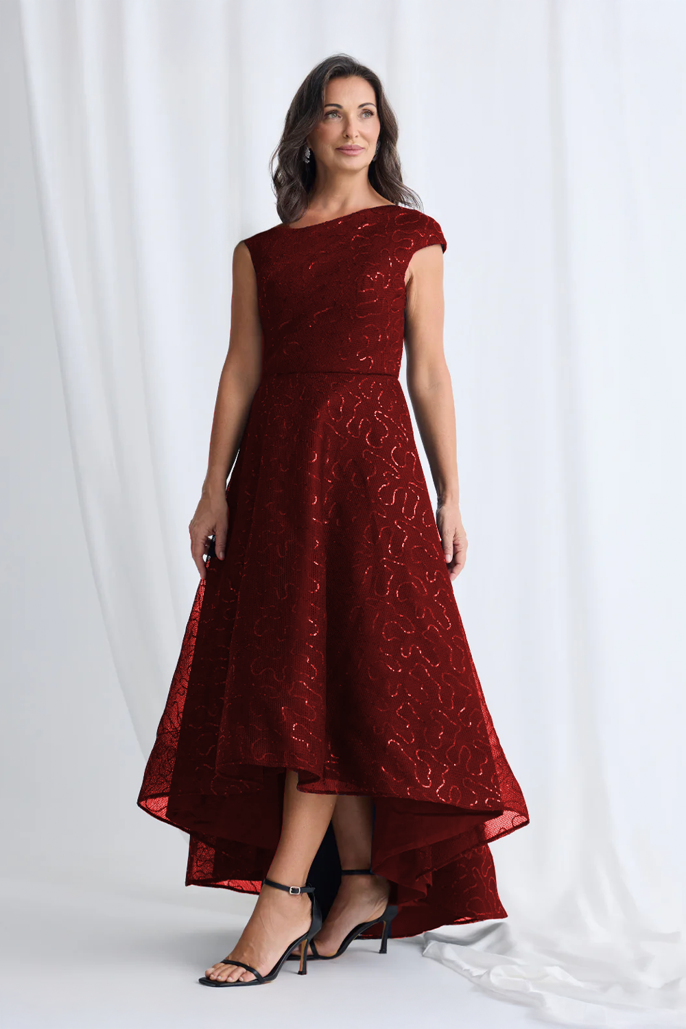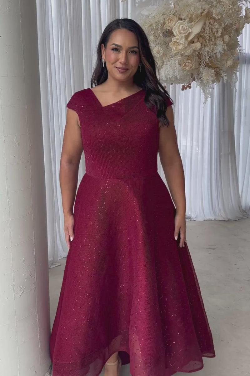 The Cora Asymmetric Dress is a standout rental for effortless occasion dressing. In a rich wine tone, it features a refined asymmetric neckline and a subtle textured shimmer that catches the light beautifully. The structured bodice is balanced by a flowing high-low skirt, creating an elegant silhouette with comfortable movement. This style suits a wide range of events and is a popular choice for weddings, cocktail functions, and evening celebrations.