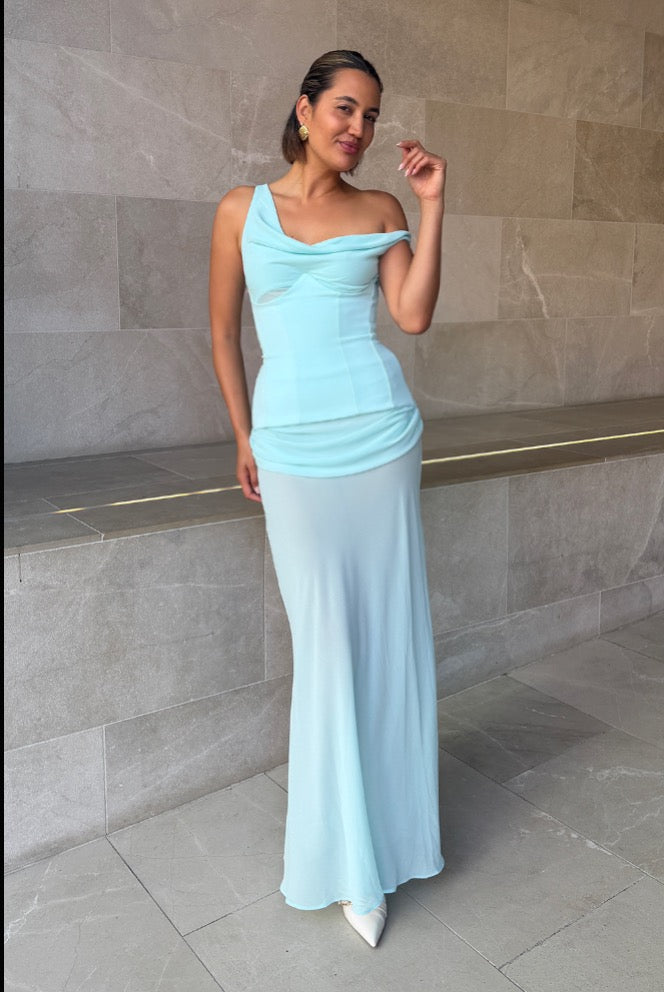 The Cadence Gown in Blue features an asymmetrical off-shoulder draping and a self-lined bust, comes with a removable corset to give you a more structured look. The corset includes a continuous under bust wire and hook-and-eye fastening for secure structure. Finishing off with a skirt that has a drape overlay at the top and side gather detailing.