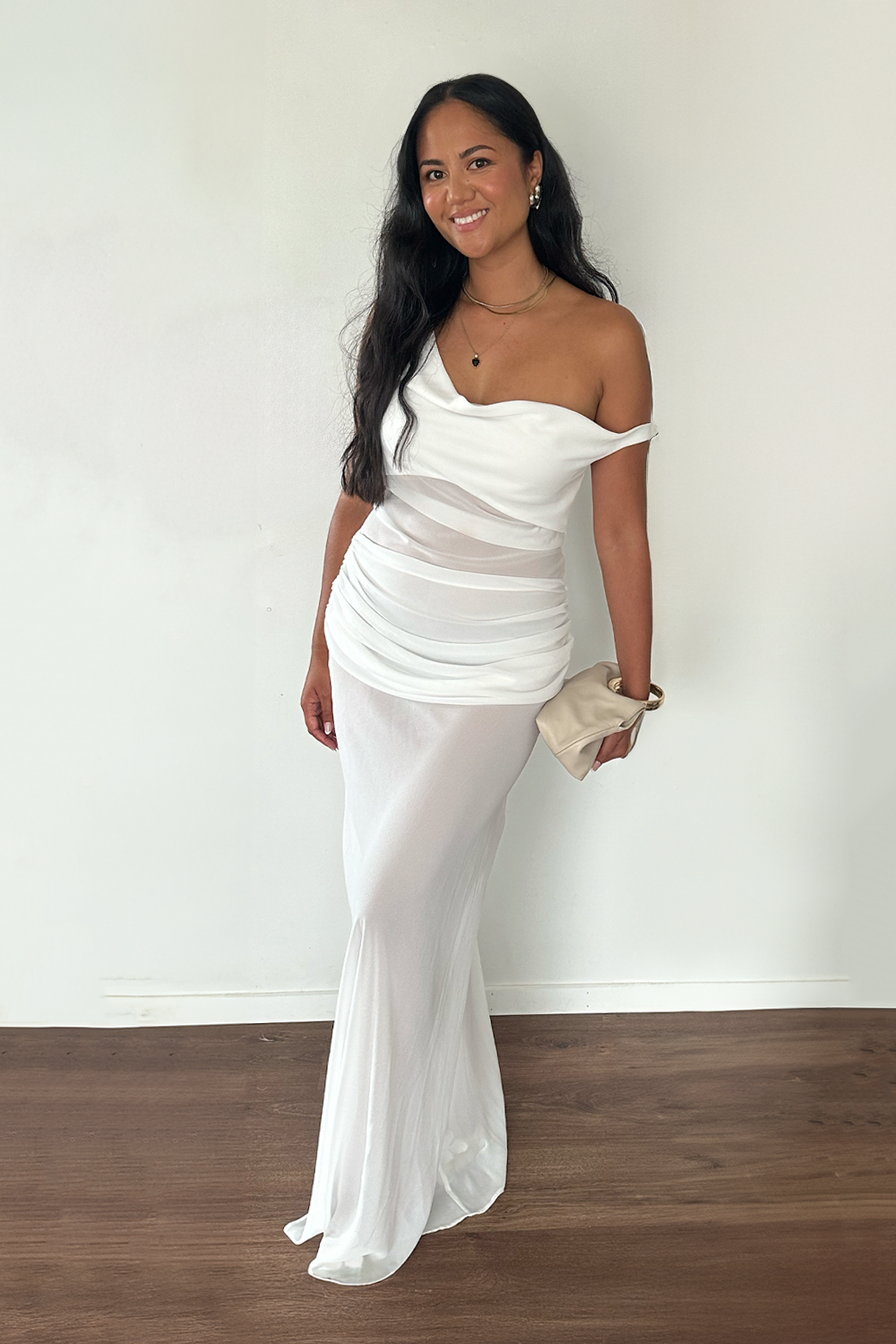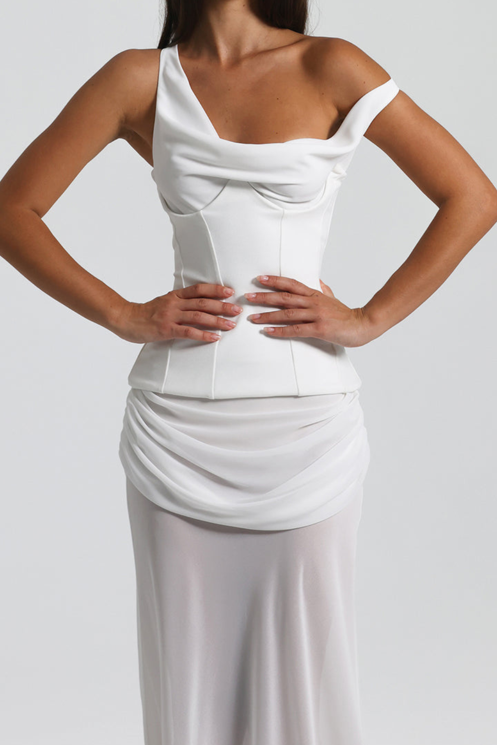 A statement dress designed for you to look beautiful at your event. Featuring asymmetrical off-shoulder draping and a self-lined bust, comes with a removable corset to give you a more structured, sculpted fit. The corset includes a continuous underbust wire and hook-and-eye fastening for secure structure. Finishing off with a skirt that has a drape overlay at the top and side gather detailing. Wear it two ways for effortless styling, perfect for formal events, weddings, and special occasions.