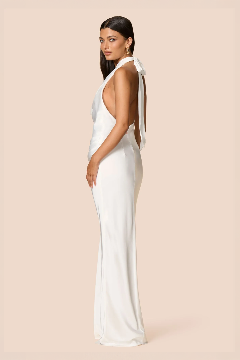 One of our most loved styles, now in a beautiful ivory colour. A lightweight satin dress featuring a plunging neckline, deep side-waist tucks, and a long back tie that adds a graceful touch. Perfect for bridal events, awards nights, and graduation.